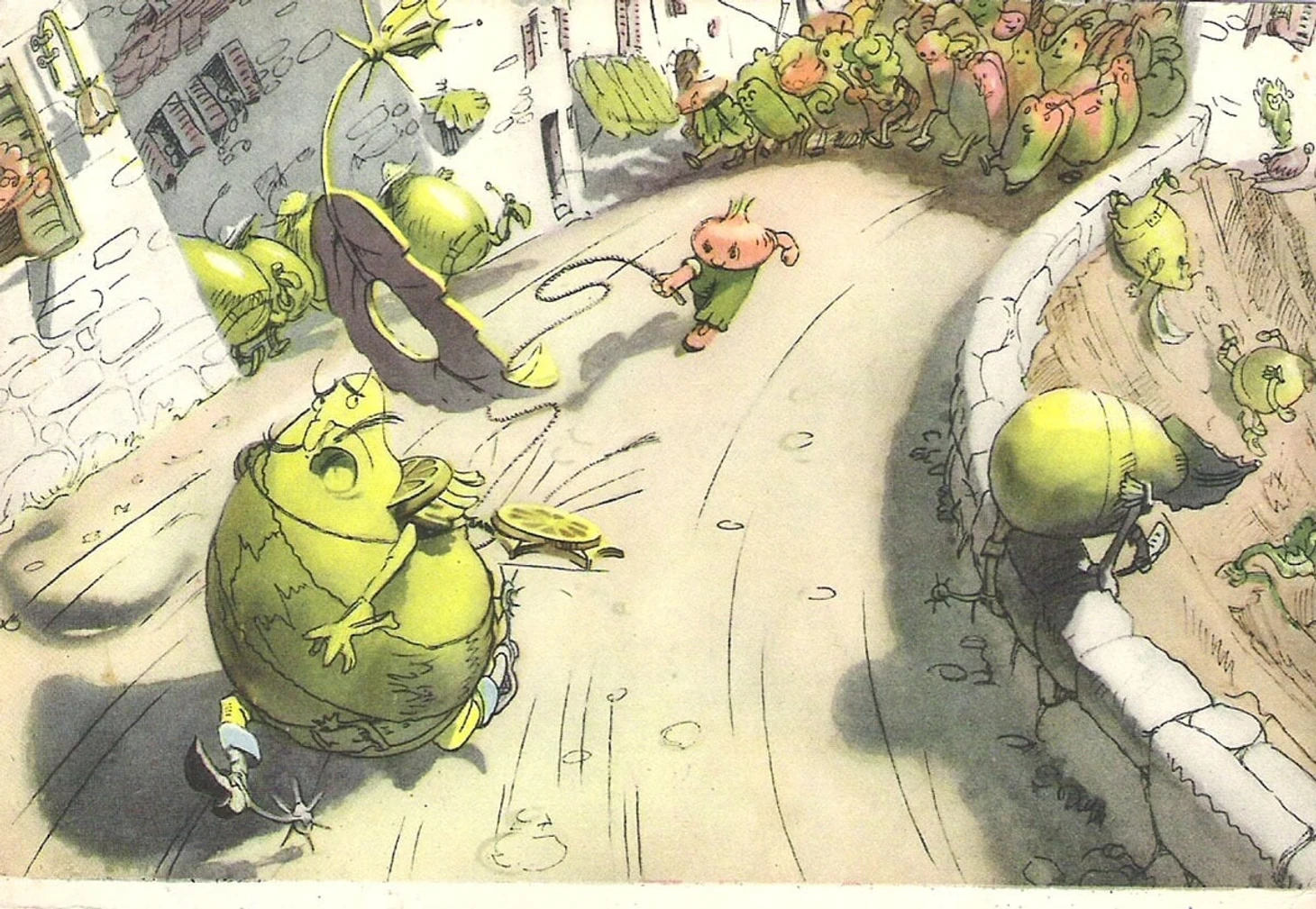 Уже в 1953-м вышел русский перевод «Чиполлино», который ежегодно переиздавался тиражом в сотни тысяч экземпляров, а иллюстрации каждый раз заказывали у лучших художников. Дальше сказка пошла в кино (четыре экранизации за 12 лет, из них две – как диафильм) и в массовую культуру. Миллионным тиражом печатались почтовые открытки со сценами из «Чиполлино» – например, «Бегство Лимона».