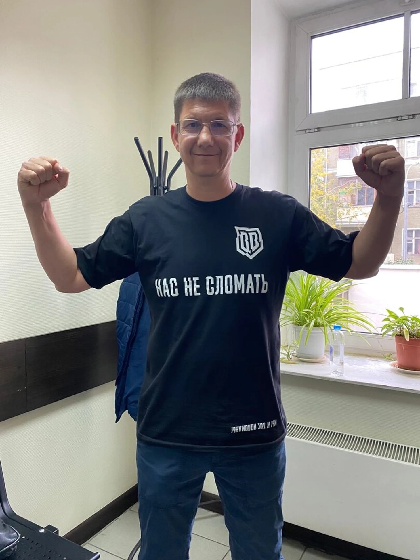 Для человека, которому грозит тюрьма, подсудимый выглядел бодро: улыбался, подходил почти к каждому гостю, а пожилым слушателям объяснял значение майки, в которой пришел на заседание.