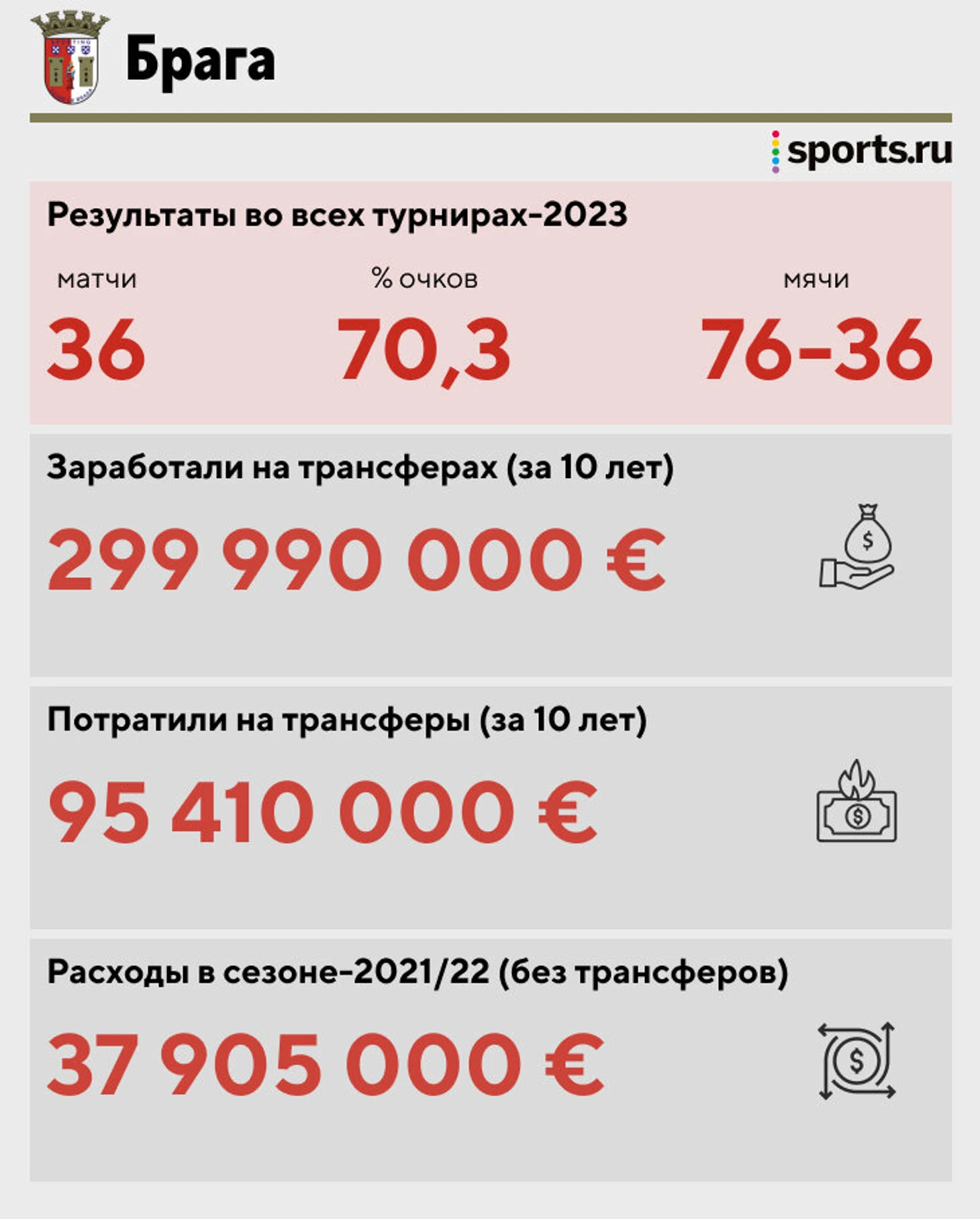 От 20 до 40% бюджета «Брага» ежегодно добирает за счет трансферов. За 10 лет продали игроков на 300 млн евро, а купили – на 95 млн. 200-миллионное сальдо – 12-й показатель в мире за 10 лет. «Из-за попадания в Лигу чемпионов у нас нет необходимости продавать игроков», – на днях объяснил важность турнира президент «Браги» Антонио Сальвадор.