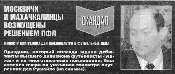 25 марта состоялись 6 матчей. Мог и седьмой, но встречу «Анжи» и «Торпедо» в Астрахани (поле в Махачкале не подготовили) отменили за сутки до начала. В РФС объяснили перенос информацией, поступившей от МВД. Президент астраханского «Волгаря» Юрий Максимов прямо сказал: ему позвонил губернатор и передал распоряжение министра МВД Рушайло «отменить встречу по непонятным причинам».