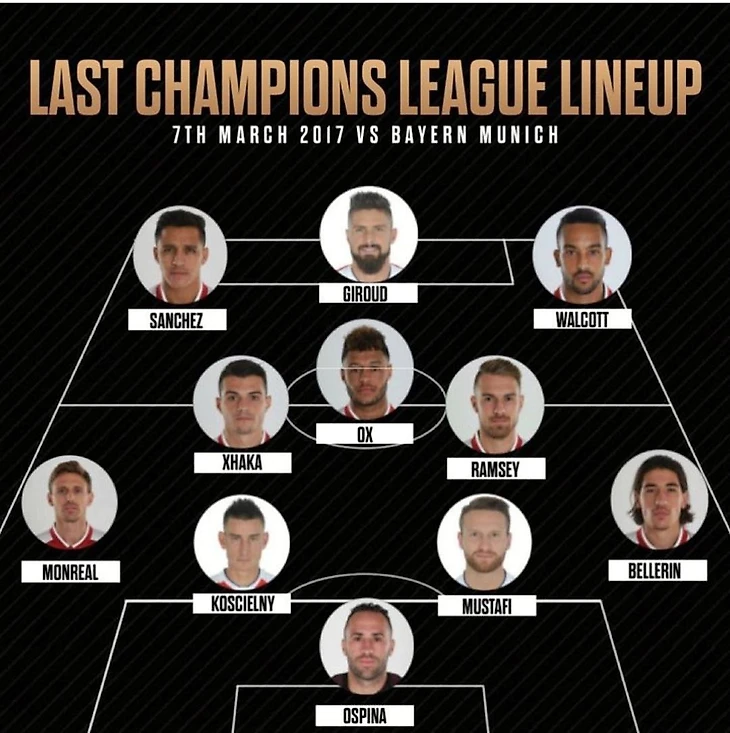 Из этих игроков, которые тогда играли крайний раз в Лиге чемпионов-никого не осталось. Кто-то либо завершил карьеру, либо играет за другие команды. Единственный, кто выступал за «Арсенал» в том сезоне Лиге чемпионов- Мохаммед Эль Нени (который числится в статусе игрока клуба до сих пор), который сейчас травмирован и помочь команде в первом туре группового этапа никак не сможет. Поэтому завтра выйдет