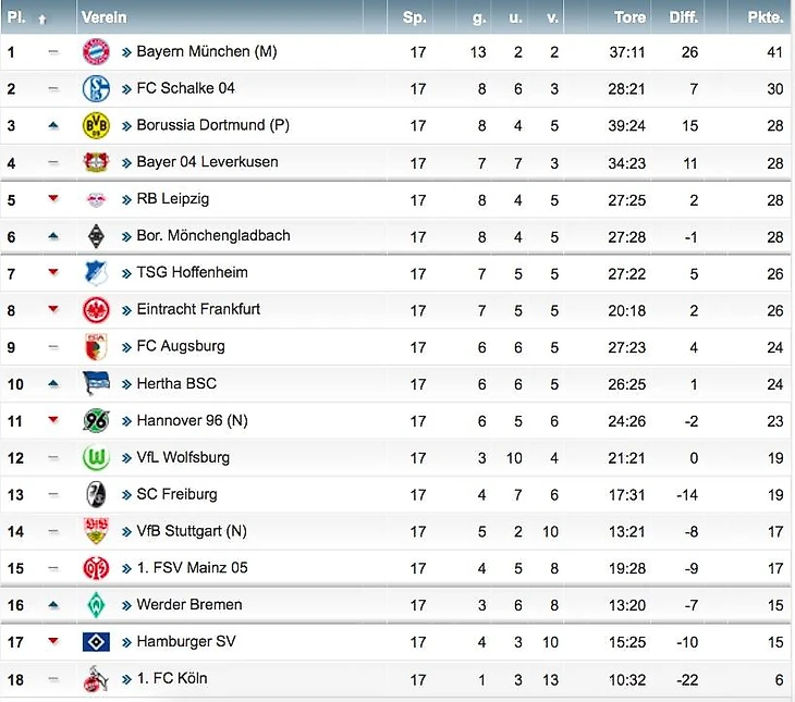 Сезон-2018/19 стартует как обычно в августе, регулярка продолжается до декабря. Команды успевают сыграть по 17 матчей, то есть провести полноценный первый круг. Здесь появляется первая загвоздка – кто-то проведет больше домашних матчей, а кто-то чаще будет посещать чужие стадионы. Но разница не военная. Таблица к тому моменту обретет форму и будет выглядеть примерно так.