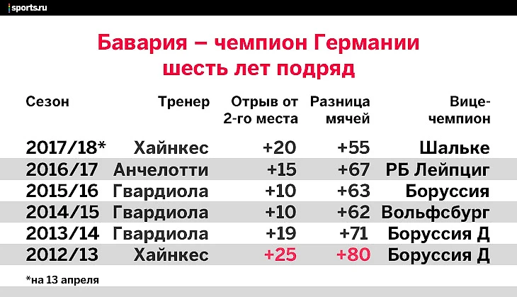 Лучший игрок и бомбардир чемпионата – в «Баварии». В топ-5 лучших ассистентов – трое баварцев. Лучшая защита лиги – тоже у «Баварии». За последние шесть лет никто не приблизился к мюнхенцам ближе, чем на 10 очков в итоговой таблице, а разница мячей выглядит так, словно в зачет идут и голы на тренировках.