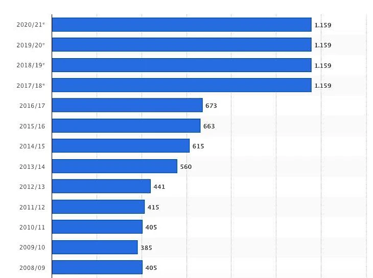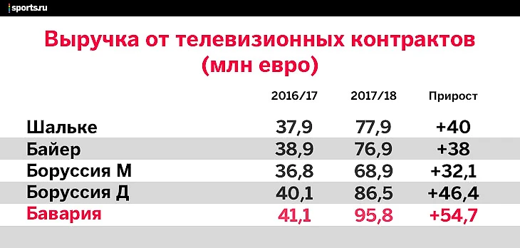 С сезона-17/18 вступил в силу новый ТВ-контракт, который будет приносить немецким клубам в сумме 1,4 млрд евро каждый год (впереди по этому показателю только АПЛ). Эта цифра – заработок от трансляций в Германии (1,16 млрд евро) плюс продажа медиаправ в другие страны (240 млн евро). Рост доходов по сравнению с предыдущим соглашением – 85%.