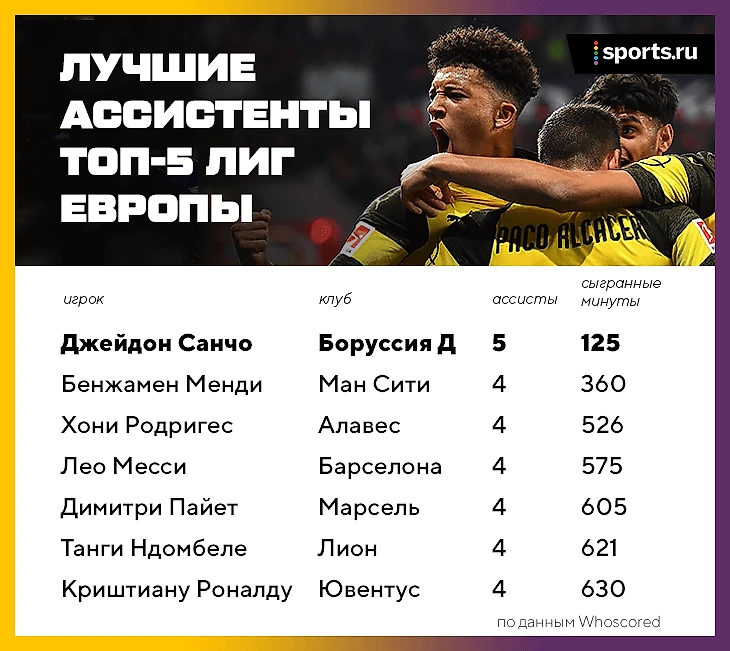 Джейдон Санчо – лучший ассистент топ-5 европейских лиг и самый эффективный игрок бундеслиги на данный момент. И это при том, что с начала сезона он еще ни разу не вышел в стартовом составе в матчах чемпионата. Джей сыграл 125 минут из 540 возможных и набрал уже 6 очков (1+5).