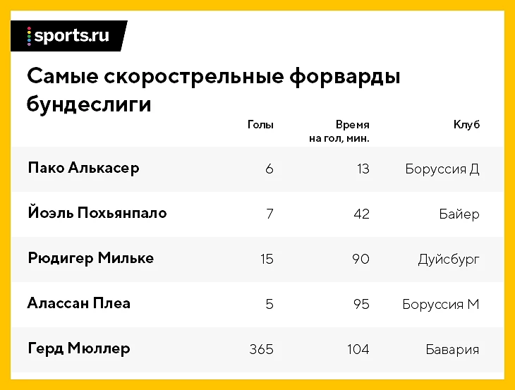 Алькасер забивает в бундеслиге каждые 13,5 минут. Никто за всю историю лиги не забивал мячи с такой частотой (берем в расчет тех, кто отличался 5 раз и более).