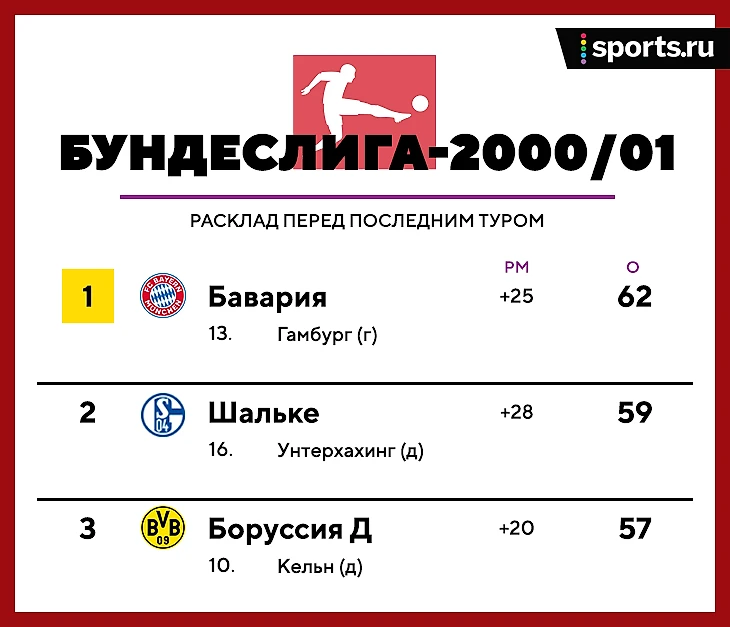 18 лет назад баварцы находились в схожей ситуации – до чемпионства им не хватало одного очка. Главный конкурент «Шальке» отставал на три, но имел лучшую разницу мячей, которая считается главным критерием при равенстве очков в бундеслиге.