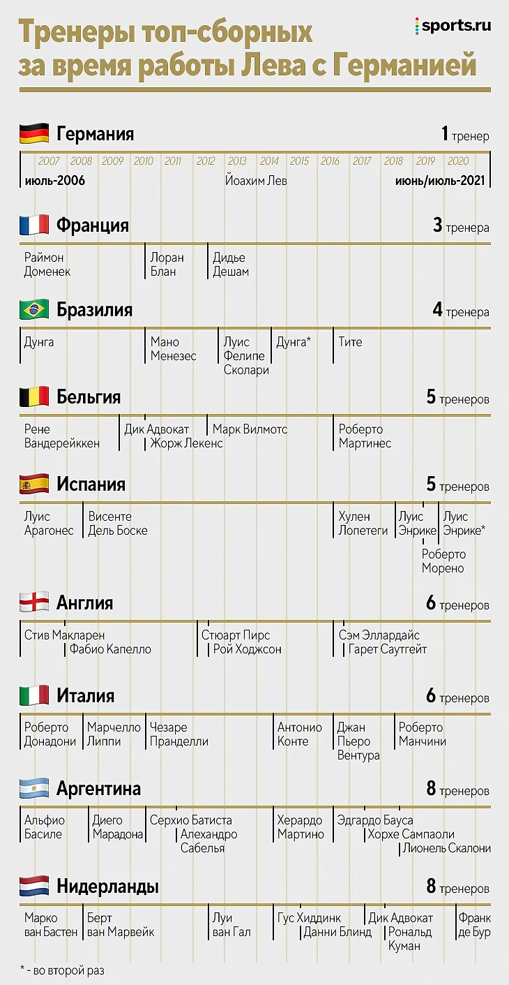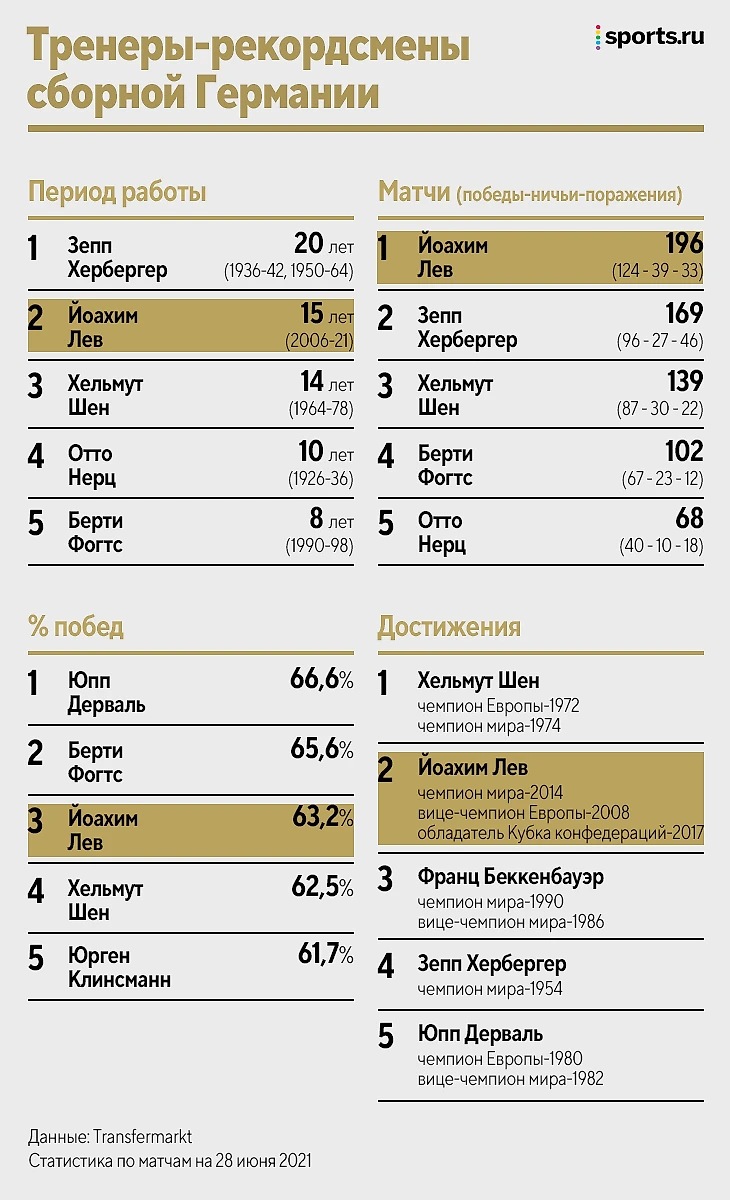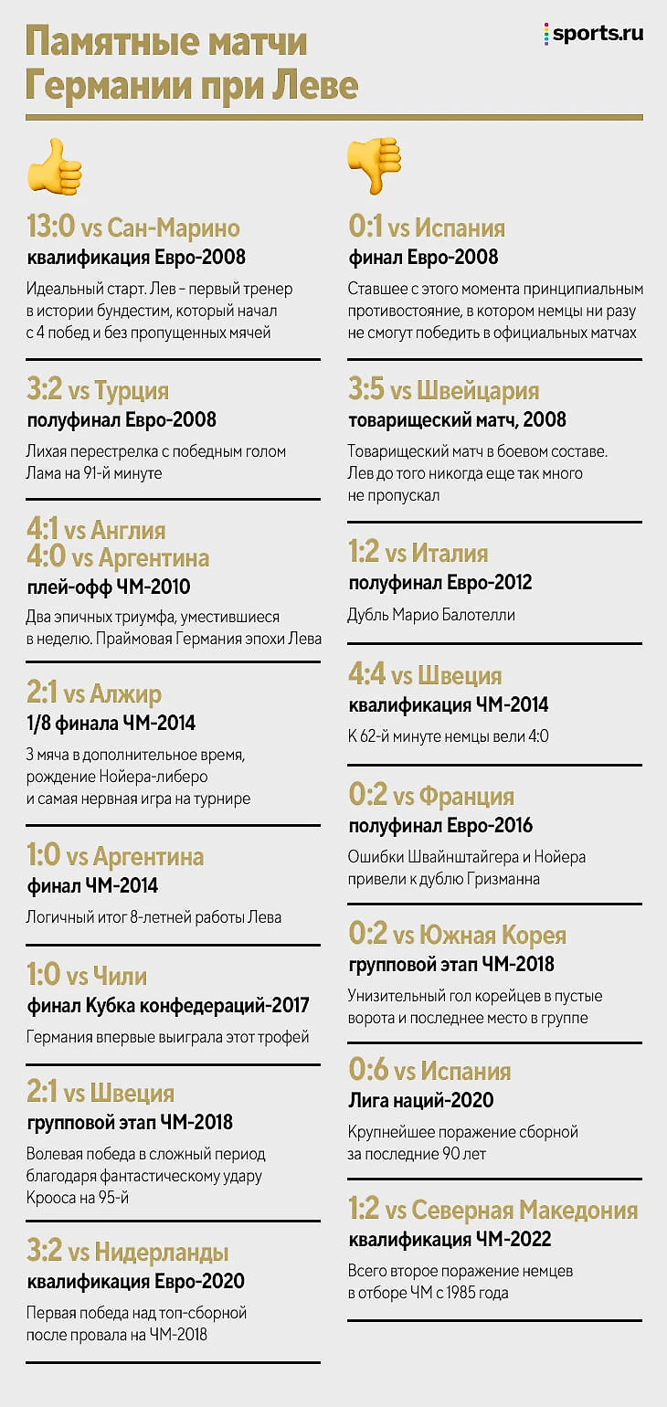 На этом кончилась эпоха Йоахима Лева. Он тренировал немцев почти 15 лет – если точнее, 14 лет и 352 дня, дольше с национальной командой в Европе не работал никто.