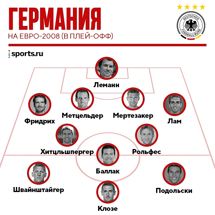 К 2008-му немцы не побеждали в финальном турнире Евро 12 лет, но в первом же матче при Леве обыграли поляков 2:0. По составу это была плюс-минус та же команда, завоевавшая бронзу на домашнем ЧМ два года назад, но по ходу турнира Йоги перестроился на схему 4-2-3-1 (до этого использовал 4-4-2), которая на долгие годы стала базовой.