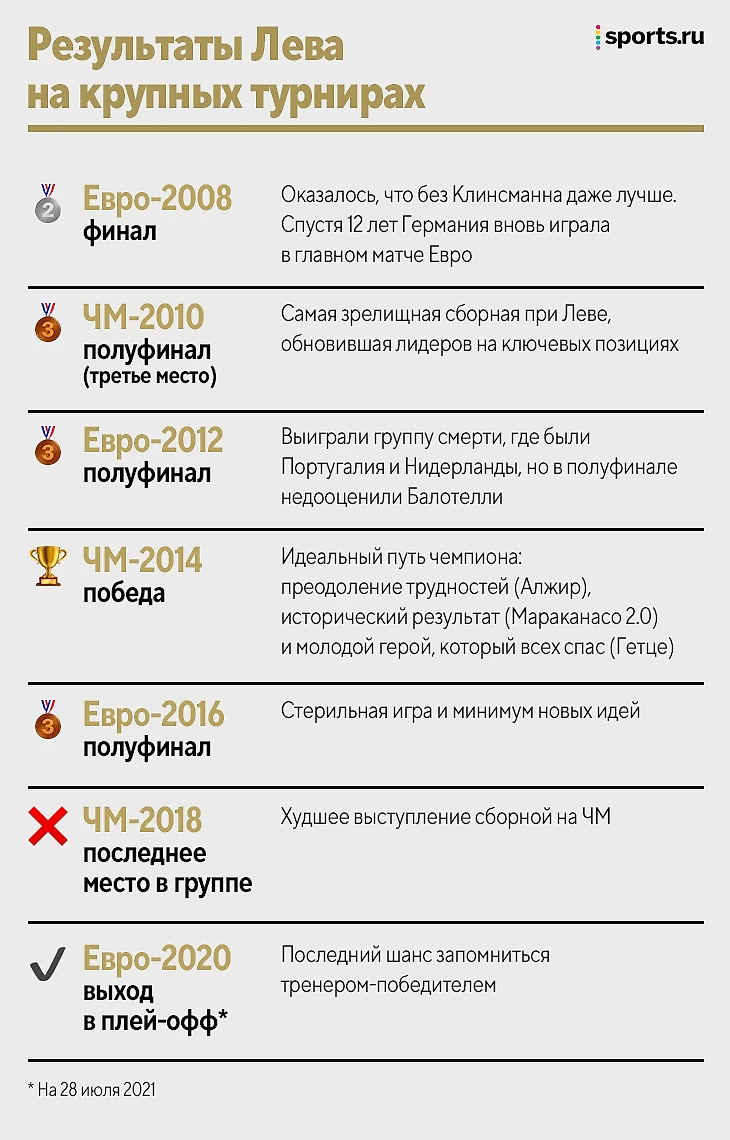 Германия дошла до финала, в котором ничего не могла сделать против Испании (4 удара по воротам, ни одного в створ) и проиграла 0:1, но Лев оценил убийственный стиль противника. Владение мячом, комбинационный футбол, короткие передачи – к тому же Леву уже тогда нравились принципы, по которым воспитывали футболистов в Ла Масии, поэтому он переложил их на свою сборную.