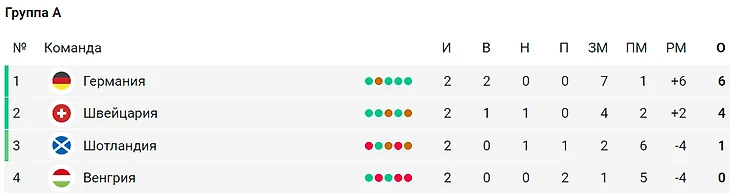 4 очка практически гарантия плей-офф в данном случае. Чтобы выйти на первое место надо побеждать Германию. Ничья второе место. Проигрыш может отправить команду на третье место, если Шотландия обыграет Венгрию и отыграет 6 мячей разницы. Например, Швейцария проигрывает 0:3, а Шотландия выигрывает 3:0.