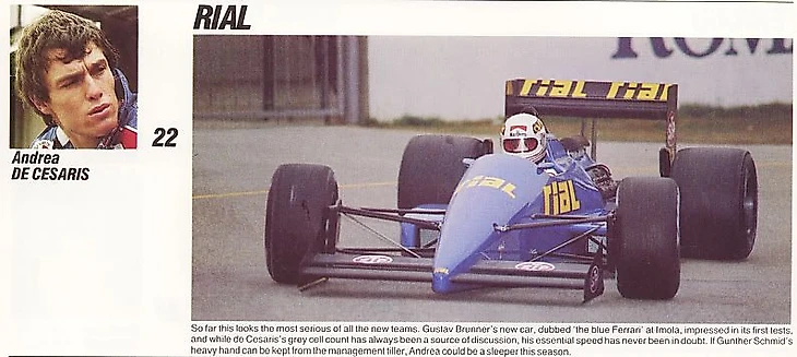 Но весьма бодрые выступления в квалификации (за весь сезон де Чезарис стабильно квалифицировался на 12-16 местах, изредка опускаясь ниже) давали повод для оптимизма. Однако сходы в Имоле (на первом же круге сломалась подвеска), Монако (отказ двигателя) и Мексике (отказ трансмиссии) не показывали потенциала болида, разве что потенциала к поломкам.