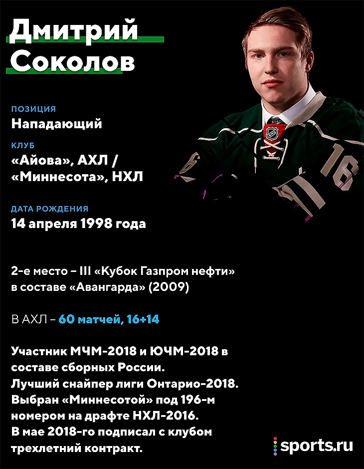 Лучший бомбардир третьего «Кубка Газпром нефти» так и не сыграл за родной «Авангард», зато достаточно близко подобрался к своей мечте – дебюту в Национальной лиге. В совсем не юниорской АХЛ 20-летний Соколов освоился достаточно быстро – и уже спокойно делает дубли в матчах за «Айову». Конечно, это далеко от его статистики в OHL (220 очков в 196 матчах), но «Миннесота» внимательно ведет своего проспекта, который уже, к слову, на контракте.