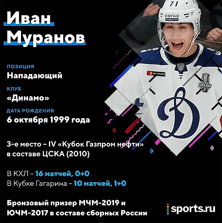 Один из парней Брагина, за которых вся страна переживала в первые дни 2019-го. Муранов так и не смог отличиться в Ванкувере – и отчасти в этом виновата травма. Зато после восстановления он получил железное место в составе «Динамо» и забросил первую шайбу в КХЛ – в дебютном матче плей-офф.