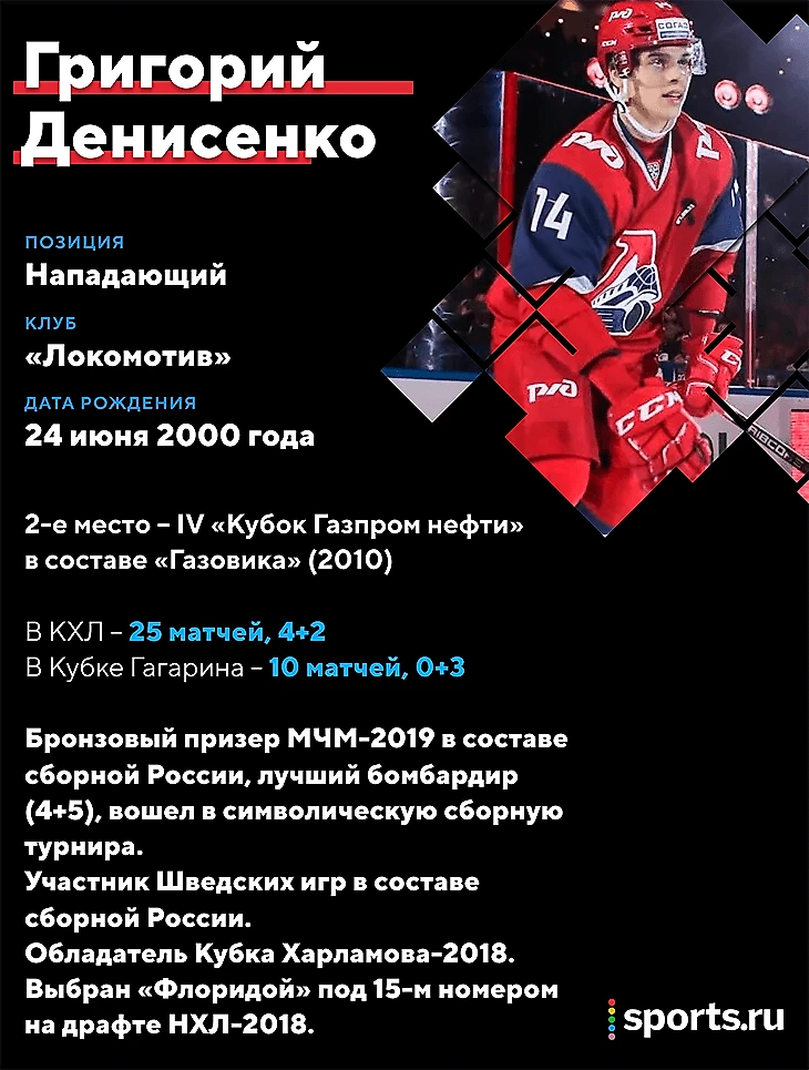 Первый раунд драфта НХЛ, лучший бомбардир МЧМ и игрок сборной России (уже в 18 лет!) – вот три факта, которые характеризуют потенциал Денисенко. Конечно, вряд ли его позовут сейчас на взрослый чемпионат мира, но если продолжит прогрессировать, то давать шансы на этапах Евротура будут. Хотя не факт, что в жизни Григория таких турниров будет много – во «Флориде» ждут окончания его контракта с «Локомотивом»: в клубе его уже назвали особенным хоккеистом и много общались с ним по ходу МЧМ-2019.