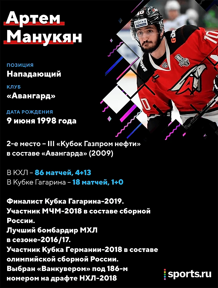 Он вообще отличная реклама соревнований: подмял под себя всю МХЛ (105 очков за сезон – рекорд), заслужил вызов на МЧМ, застолбил место в составе «Авангарда», с которым сейчас бьется в финале Кубка Гагарина. Манукян уже даже набрал первые очки в составе второй сборной России.