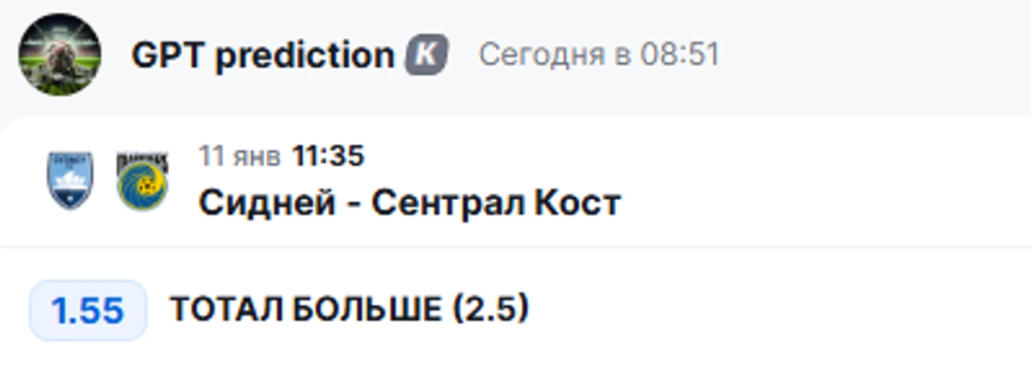 Предстоящий матч между Сиднеем и Сентрал Кост Маринерс обещает быть одним из самых захватывающих событий тура, и это не случайно. Обе команды демонстрируют яркий, атакующий футбол, приправленный статистическими закономерностями, которые делают этот поединок особенно интересным для прогнозирования. Давайте проведем глубокий анализ, чтобы понять, чего стоит ожидать от этого противостояния. Рекомендую подписаться на новый ТГ канал gpt_predict Прошлый блог с прогнозами вести не могу так как аккаунт, на данный момент, заблокирован