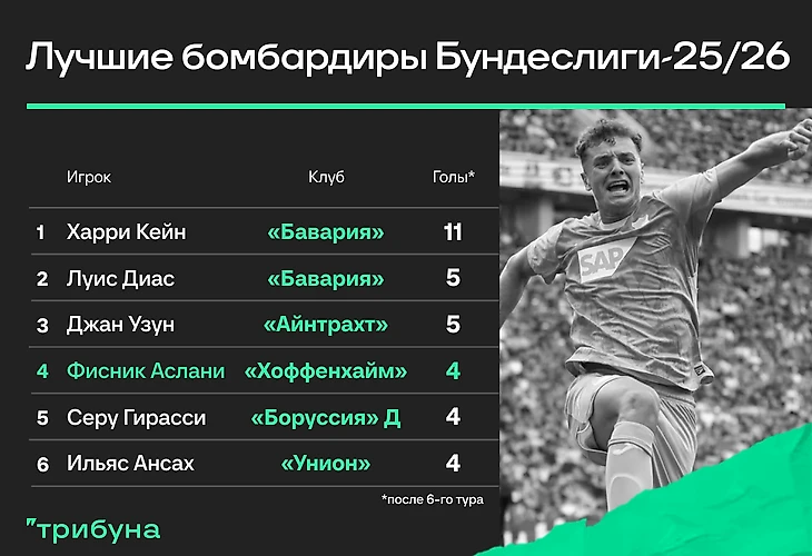 В следующих трех турах Аслани немножко сбавил голевой темп: забил только «Фрайбургу», пожалел «Баварию» и «Кельн». Прямо сейчас Фисник – четвертый бомбардир Бундеслиги.