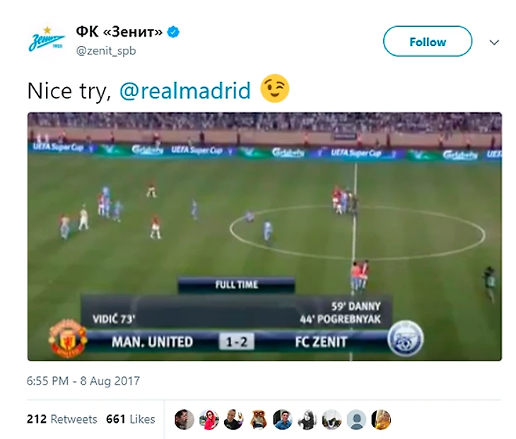 Питерский клуб напомнил, что они уже обыгрывали «Манчестер Юнайтед» в Суперкубке Европы с таким же счетом, как и «Реал».