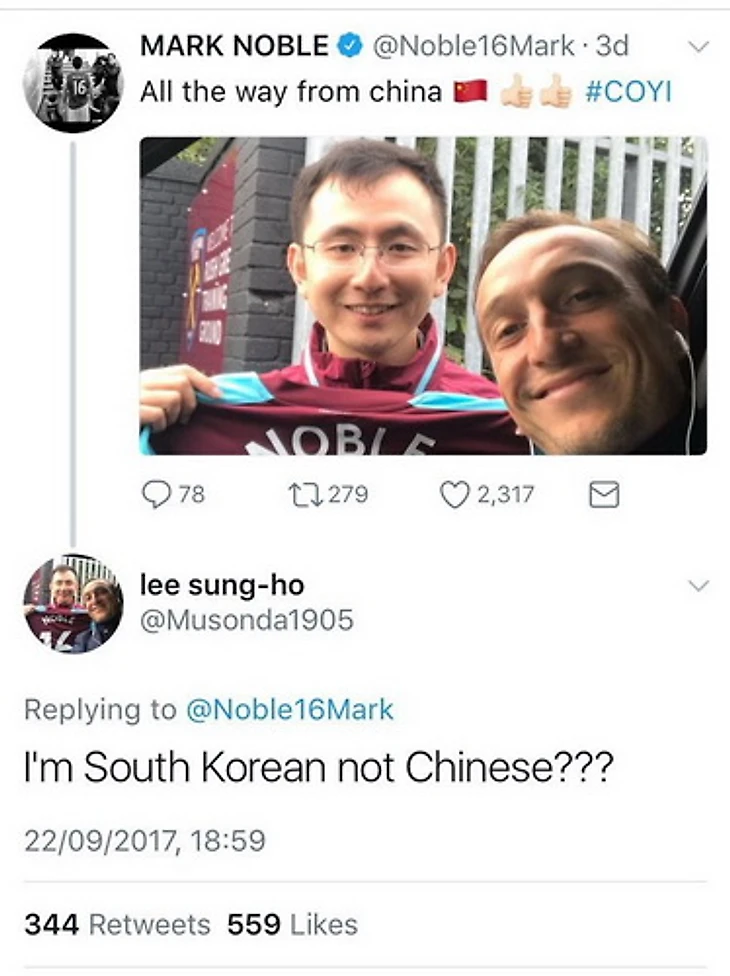 Марк Нобл сфотографировался с болельщиком и выложил снимок в твиттер, упомянув Китай. Фанат остался недоволен: он пришел в комментарии и написал, что из Южной Кореи. Упс.