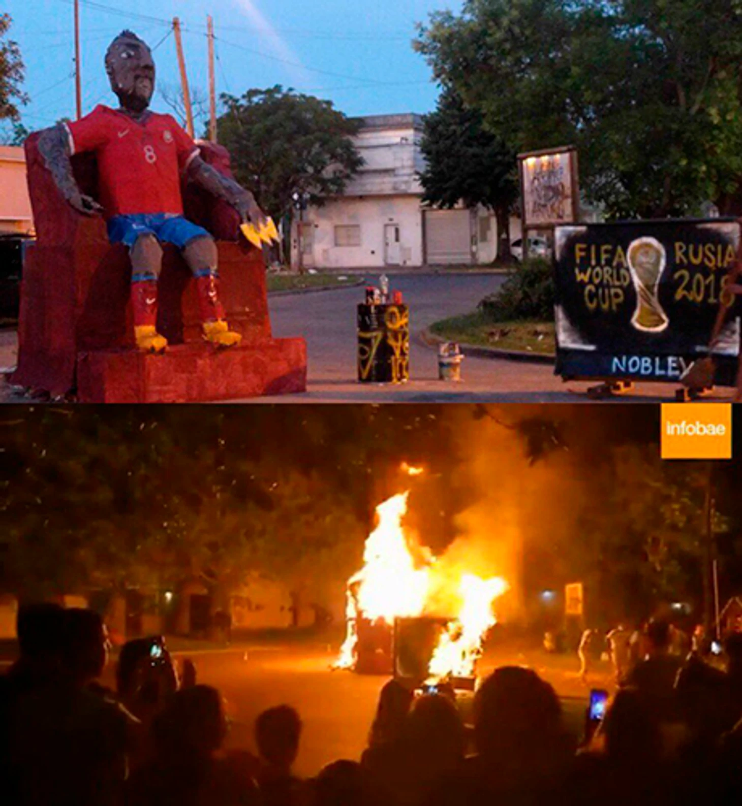 Аргентинцы сделали чучело чилийского футболиста Артуро Видаля, который смотрит чемпионат мира по футболу 2018 по телевизору. А потом сожгли издевательское изображение.