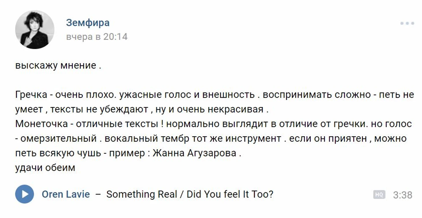 Все началось 19 июля, когда она поделилась мнением о певицах Гречке и Монеточке, которых назвали «новыми Земфирами». По мнению Земфиры, у первой «ужасные голос и внешность», у второй – «отличные тексты, нормальная внешность, но омерзительный голос».