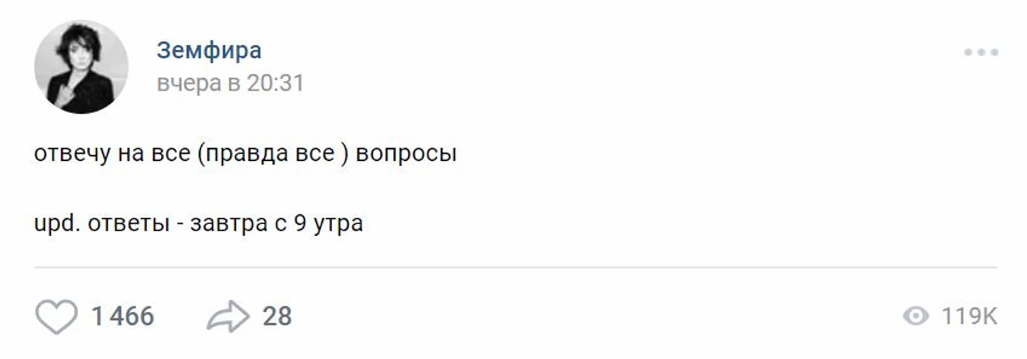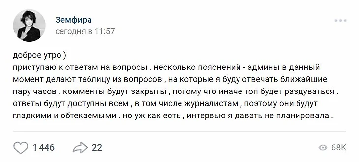 Земфира ответила на вопросы подписчиков группы «ВКонтакте» в режиме AMA (ask me anything, «спроси меня о чем угодно», – Sports.ru).