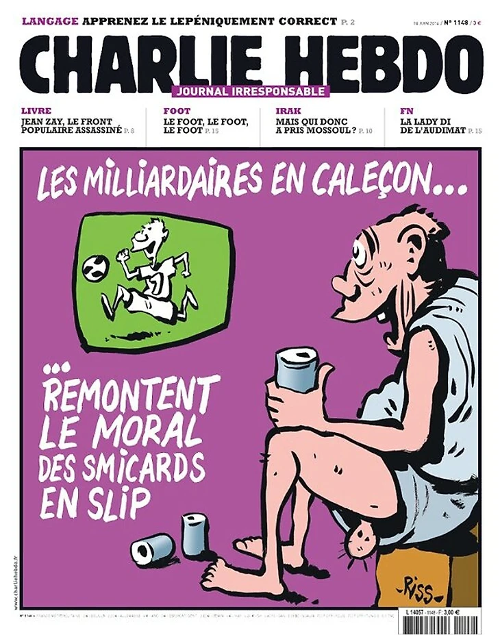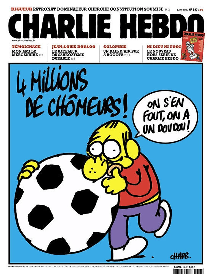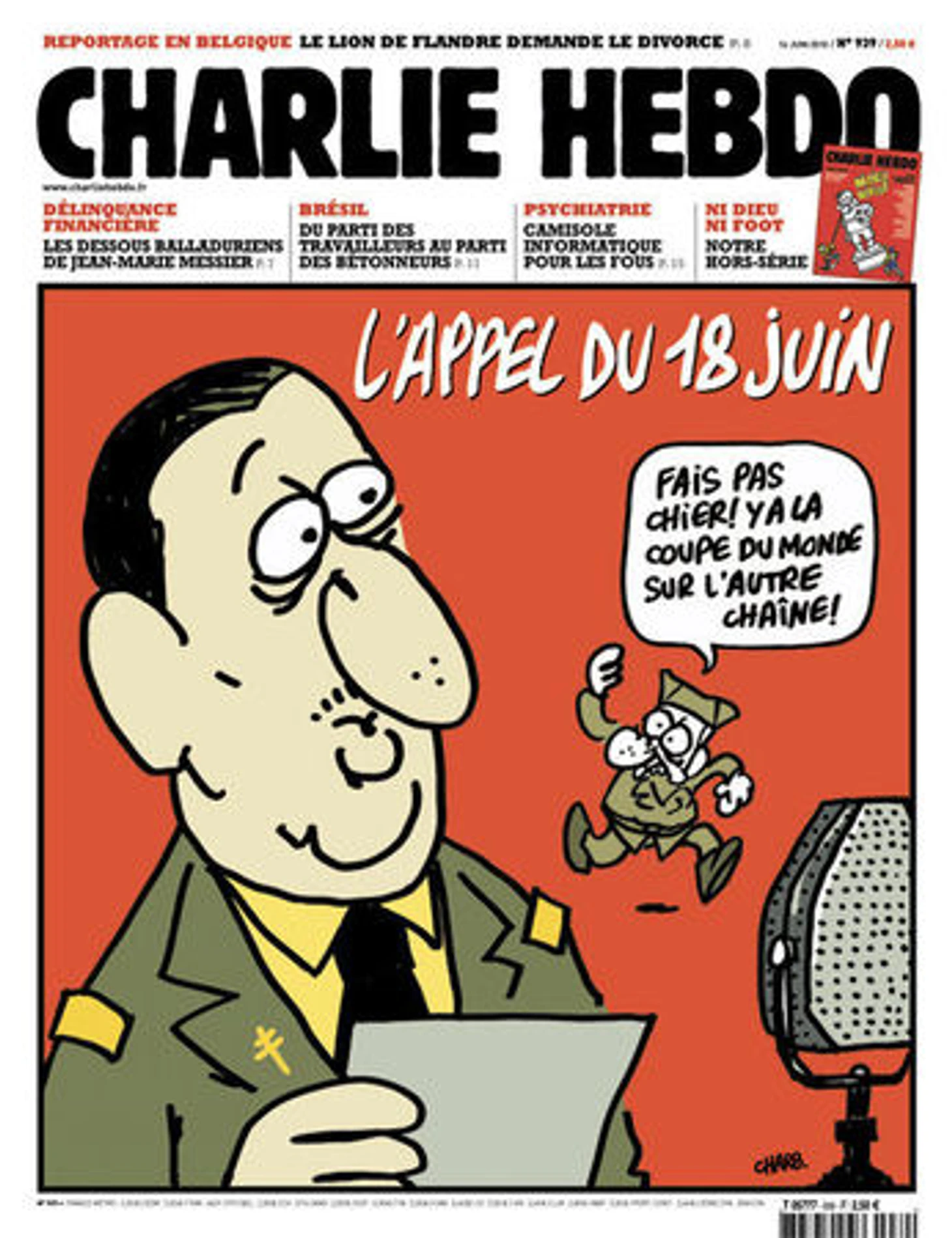 В день празднования юбилея знаменитой речи Шарля де Голля сборная Франции играла на ЧМ-2006 матч с Южной Кореей. С де Голлем у Charlie Hebdo тоже давние счеты – в середине 80-х его прародителя, журнал Hara-kiri Hebdo, закрыли через суд из-за шутки про авторитарного экс-президента Франции. Открылся журнал уже под новым названием.