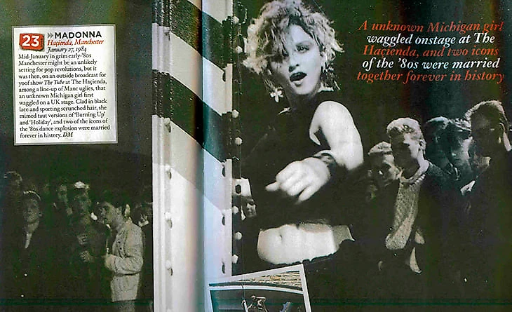 В 1984 году в Hacienda состоялось первое выступление Мадонны в Британии. Ребята из Factory заполучили ее благодаря знакомству с ее парнем – диджеем Марком Каминсом. Клуб выбрали для записи спецвыпуска музыкальной передачи The Tube. Тогда Мадонна была еще малоизвестной, но перспективной певицей из Нью-Йорка. На концерте был Норман Кук (больше известный как Fatboy Slim), он рассказывал, что толпа слушала пение Мадонны как завороженная.