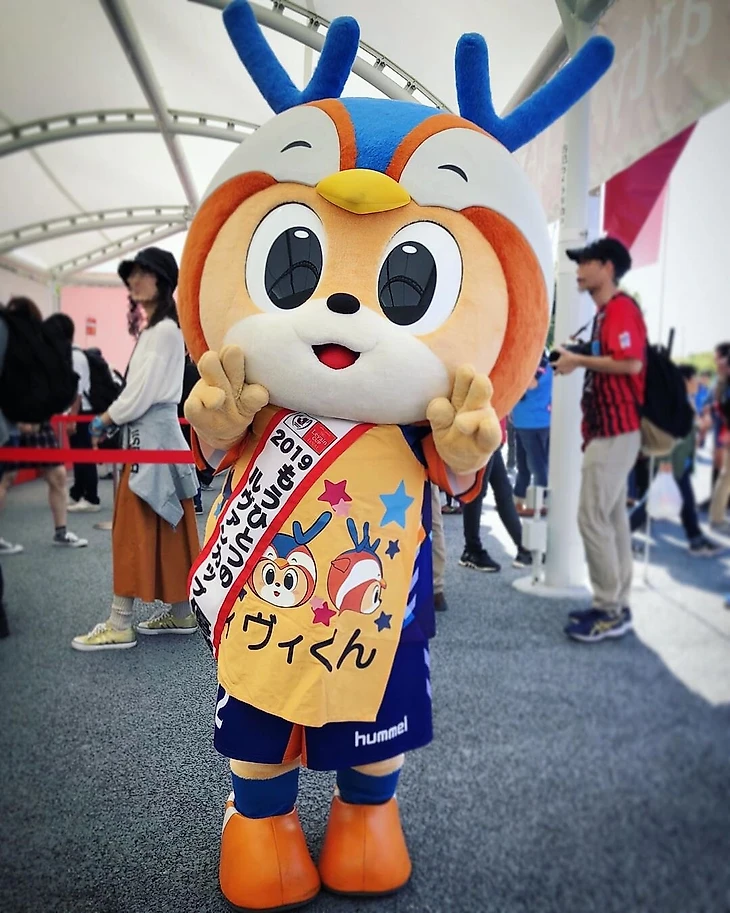 Классический японский талисман, его зовут Виви-кун – да, это олень, одетый в утку (даже с клювом). Он в минувшем голосовании занял второе место. Это талисман команды «Ви-Варен» Нагасаки. Чаще всего имена талисманов связаны с названием клуба.