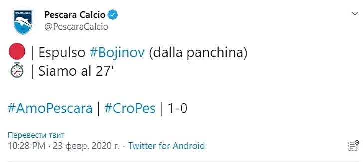 Красную Валери получил за оскорбления резервного арбитра и протесты – правда, даже в «Пескаре» не очень поняли, против какого конкретно решения судьи спорил Божинов. В интервью после игры игроки и тренеры заявили, что лучше спросить у самого футболиста.