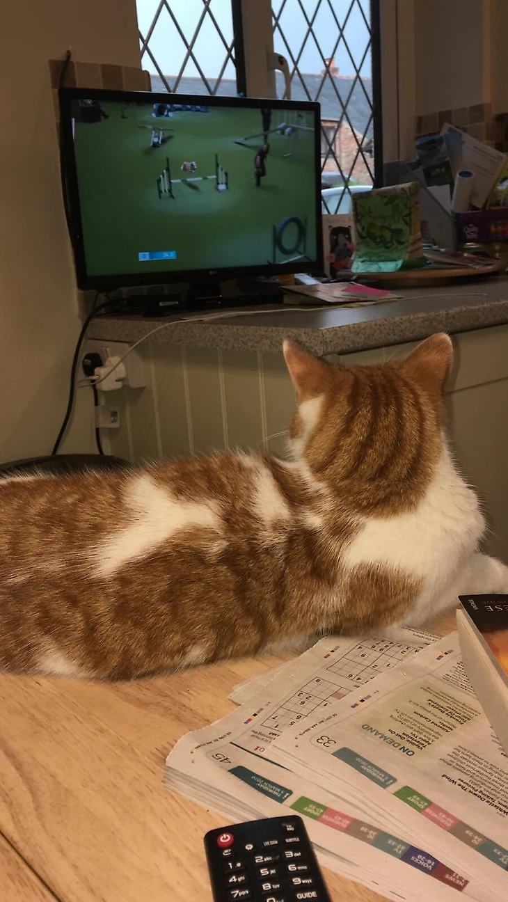 А это серьезный кот: его зовут Борис Беккер. Он предпочитает смотреть за соревнованиями собак по ТВ.