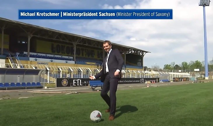 • Стартовый свисток и первый удар по мячу сделал министр-президент Саксонии (земли, в которую входит Лейпциг) Михаэль Кречмер.