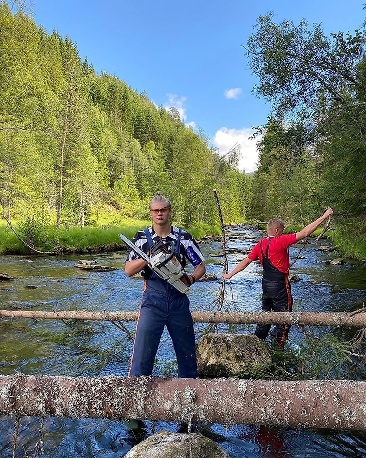 Там молодой нападающий вместе с отцом Альфом-Инге Холандом пилил деревья на реке. Подпись в инстаграме Эрлинга: «Зима близко, время рубить деревья». В твиттере подпись немного другая: «Каникулы = работа».