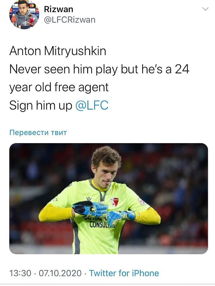 Однако реальность оказалась жестокой – «Ливерпуль» объявил лишь о переходе 17-летнего бразильского кипера из «Флуминенсе», вряд ли им можно заменить Адриана. После этого болельщики начали судорожно перебирать все возможные варианты из свободных агентов. И нашли! Антон Митрюшкин!