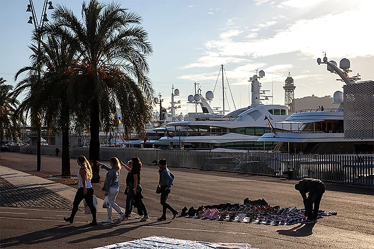 Если вы были в Барселоне, то вы понимаете, о чем речь – крепкие темнокожие мужчины торгуют всякой всячиной (китайские копии очков, сумок и прочего), расстилая покрывало. Как только на горизонте появляется полиция, они сворачивают покрывало в узелок и убегают.