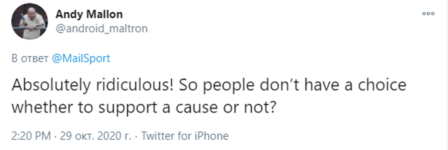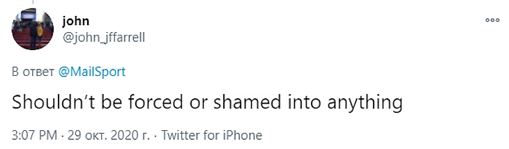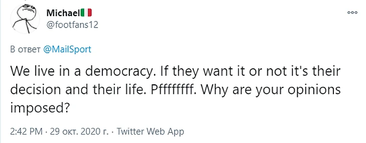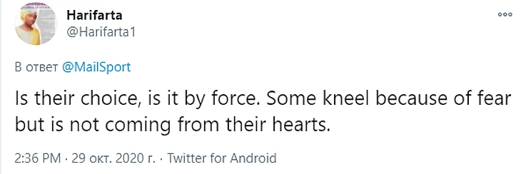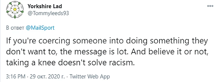 «Эта традиция есть только в Англии. Игрокам из других стран не нужно делать то, что они не делают в домашних лигах. Это не расизм. Люди борются с расизмом разными методами. Но они тоже против расизма», – спокойно объяснил один из пользователей в реплаях.