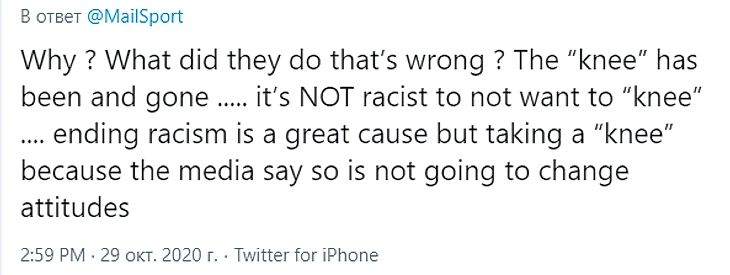 «Что они сделали не так? «Колено» было и ушло. Не хотеть преклонить колено – НЕ расизм. Прекращение расизма – великое дело, но вставание на колено только потому, что медиа говорят об этом, ничего не изменит».