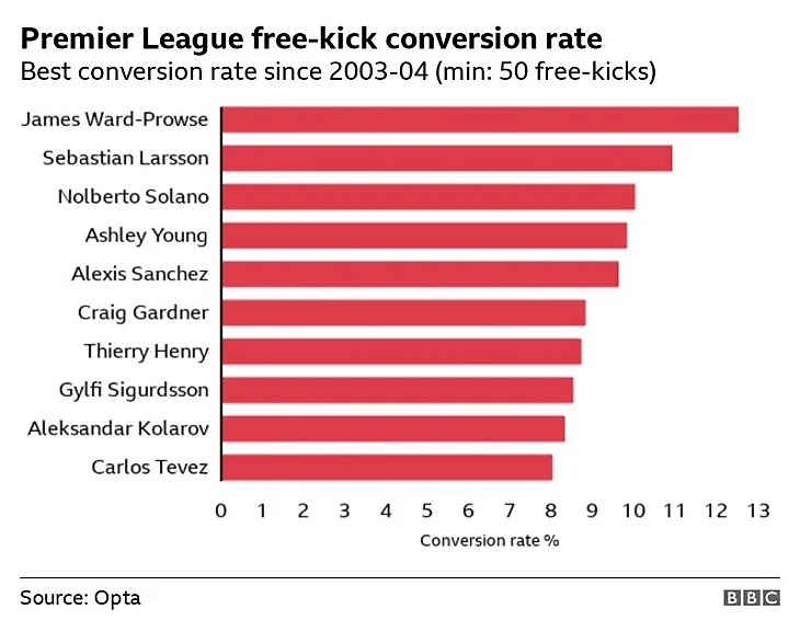Прямо сейчас 12,5% попыток Джеймса заканчиваются голом. Это лучший коэффициент реализации среди игроков АПЛ, выполнивших больше 50 штрафных ударов с сезона-2003/04 (с этого момента Opta ведет такую статистику).