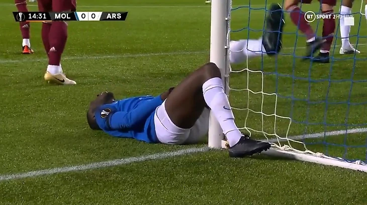 Но это еще не самое неприятное: после удара Шериф проскользил по газону, его левая нога оказалась в воротах, правая – с другой стороны от штанги. А пахом он влетел прямо в металл. Уф.