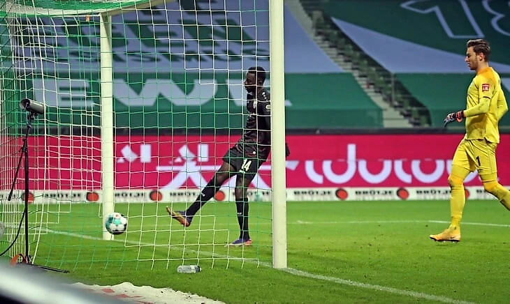 Закатить мяч и побежать праздновать? Нет, конголезец встал перед пустыми воротами и ждал, когда к нему побегут обреченные игроки «Вердера». И только после этого вбил мяч.