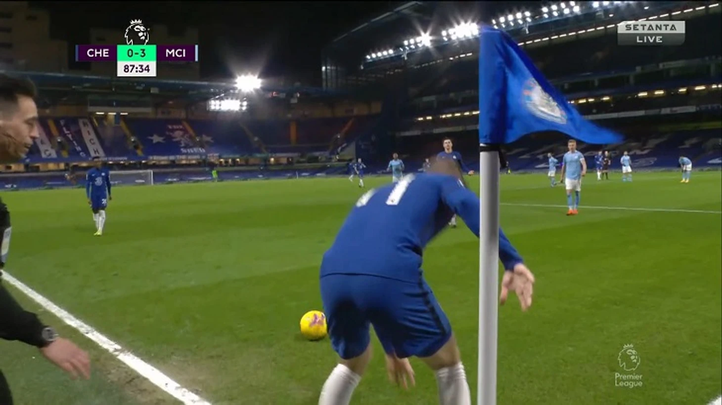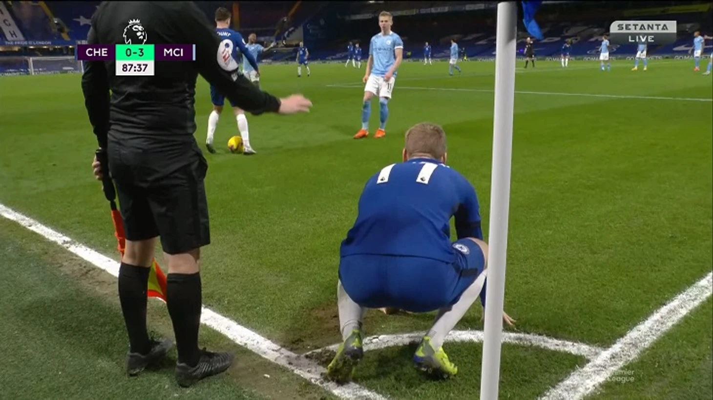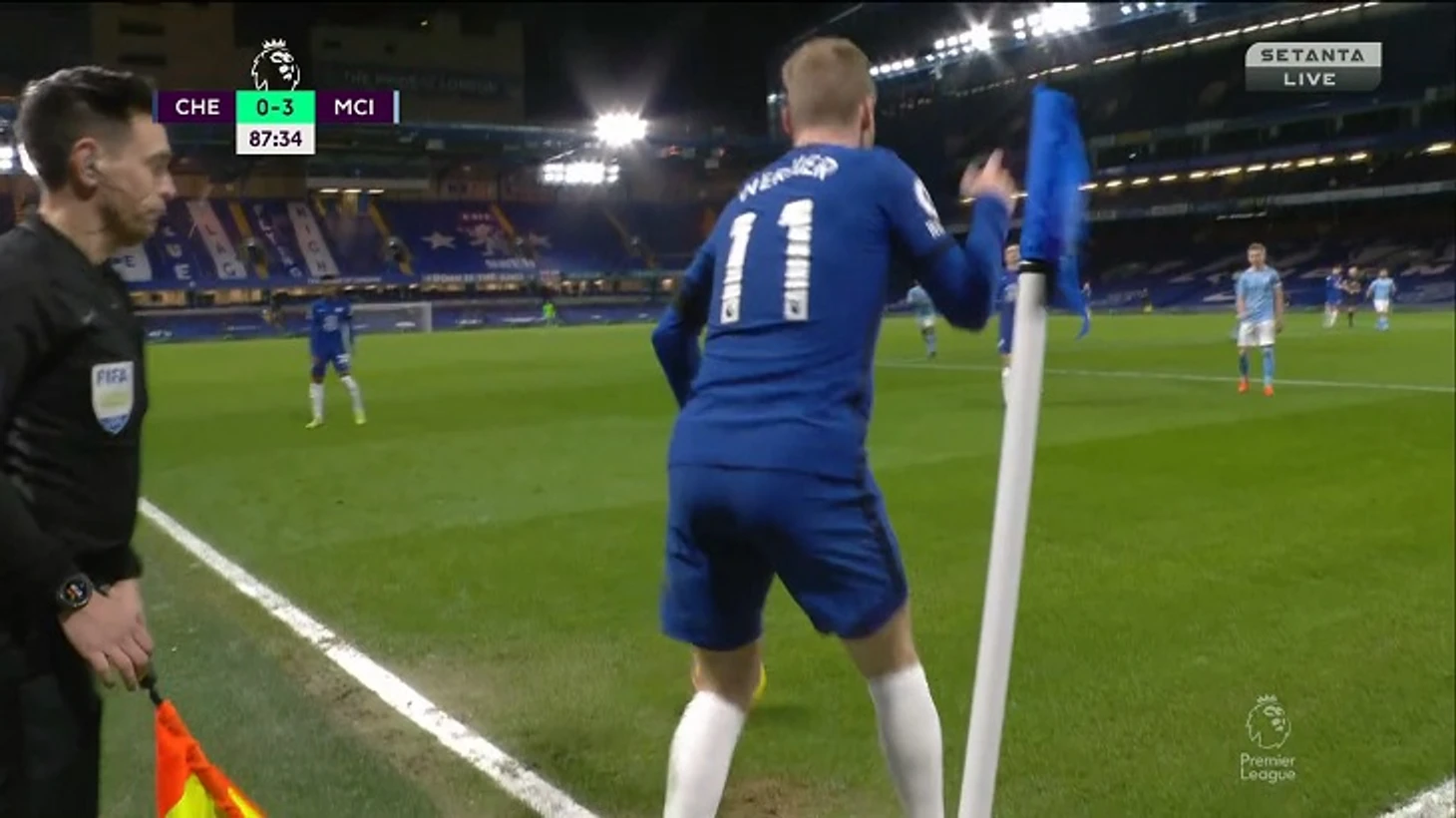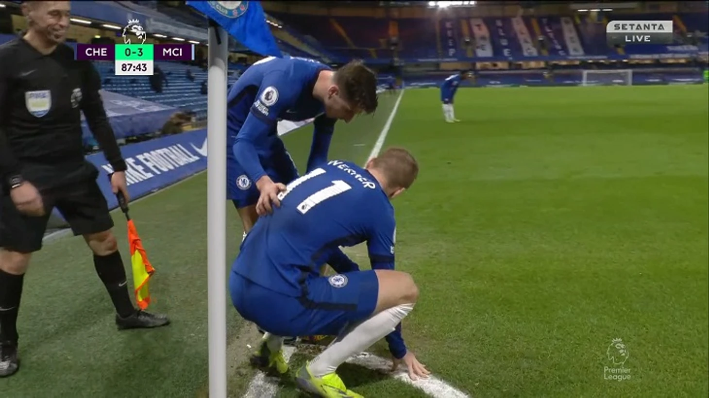 Обычно угловые подает Маунт, но Вернер хотел быстро разыграть с партнером. Но так спешил, что воткнул ногой в угловой флажок.