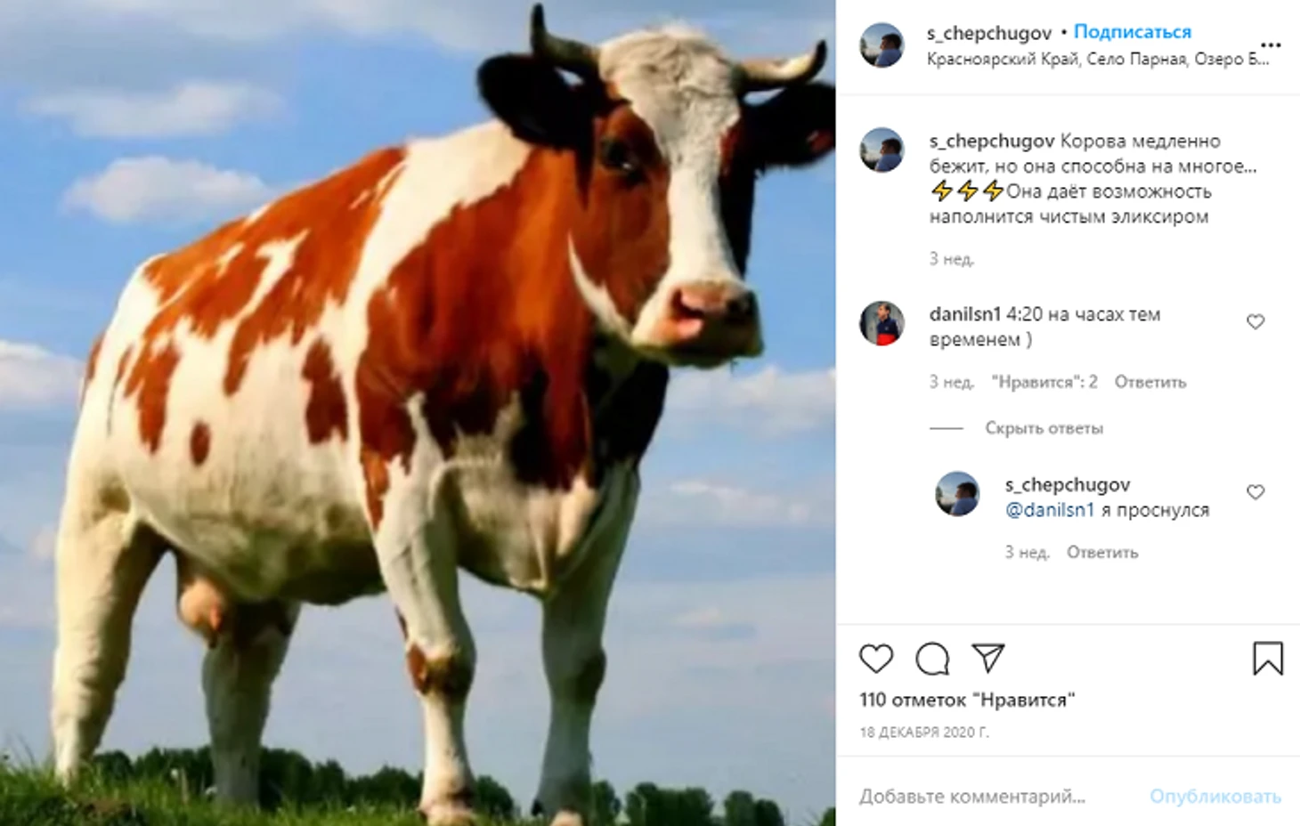 «Корова медленно бежит, но она способна на многое... ⚡️⚡️⚡️ Она дает возможность наполнится чистым эликсиром», – написал Чепчугов в 4:20 утра.