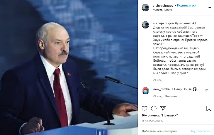 Летом выдал немного политической аналитики: «Лукашенко А.Г. Дядька-то серьезный! Выстраивая систему против собственного народа, а ранее защищал! Творит хауз у себя в стране! Против народа, зачем? Нет предубеждений вы, лидер! Серьезный человек в мировой политике, но хватит страданий! Бойтесь, чтобы народ вас не заставил, прокричать ку-ка-ре-ку! Были дали, былые, сегодня не дали, мы делили – кто у руля?»
