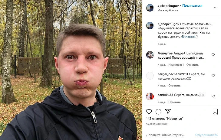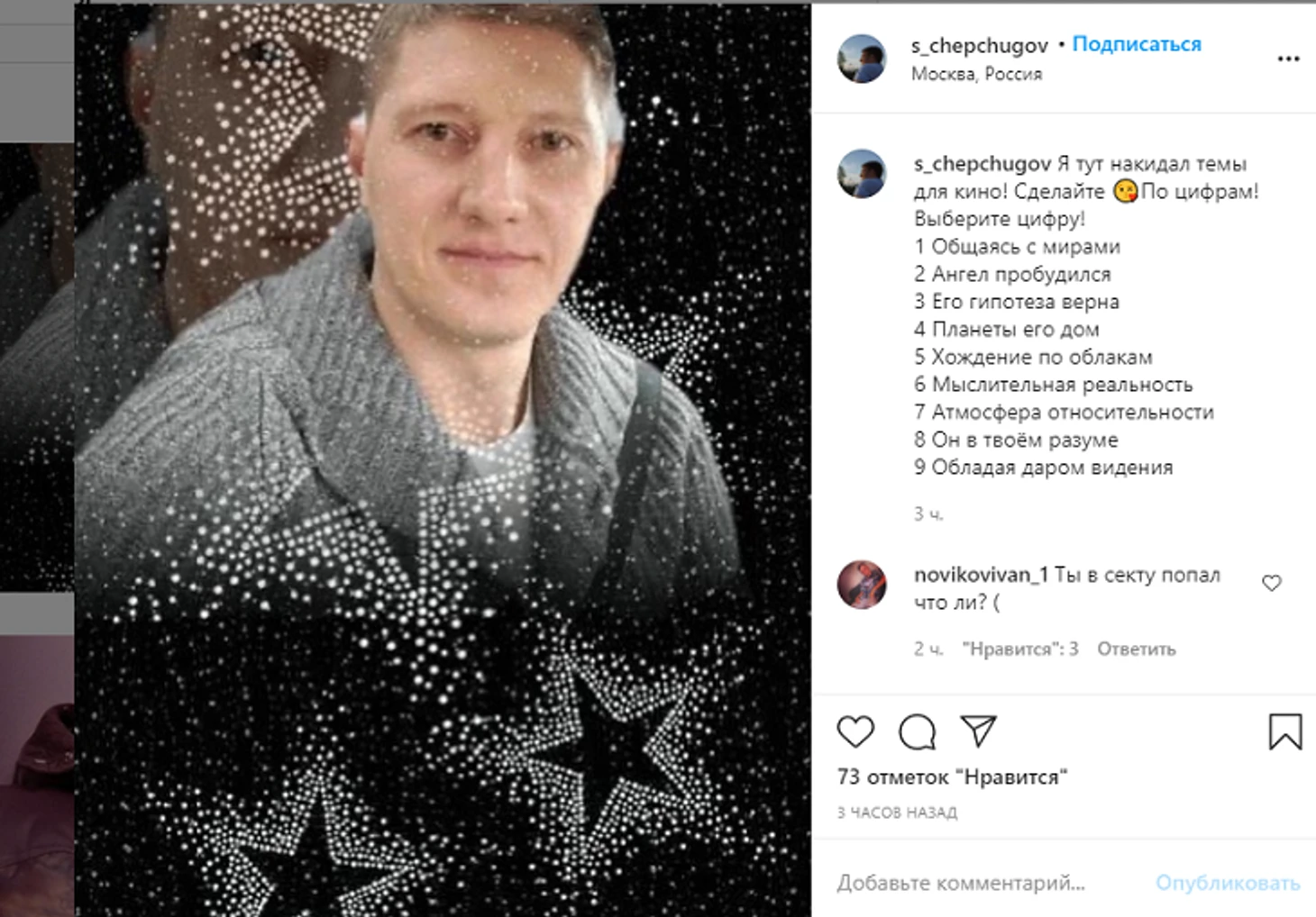 Зато в последнее время происходит что-то необъяснимое в инстаграме Чепчугова. Если раньше он разбавлял аккаунт фотографиями с дочерью, то теперь каждый пост – маленький шедевр, который страннее предыдущего. Вот Сергей накидал для подписчиков темы для кино: