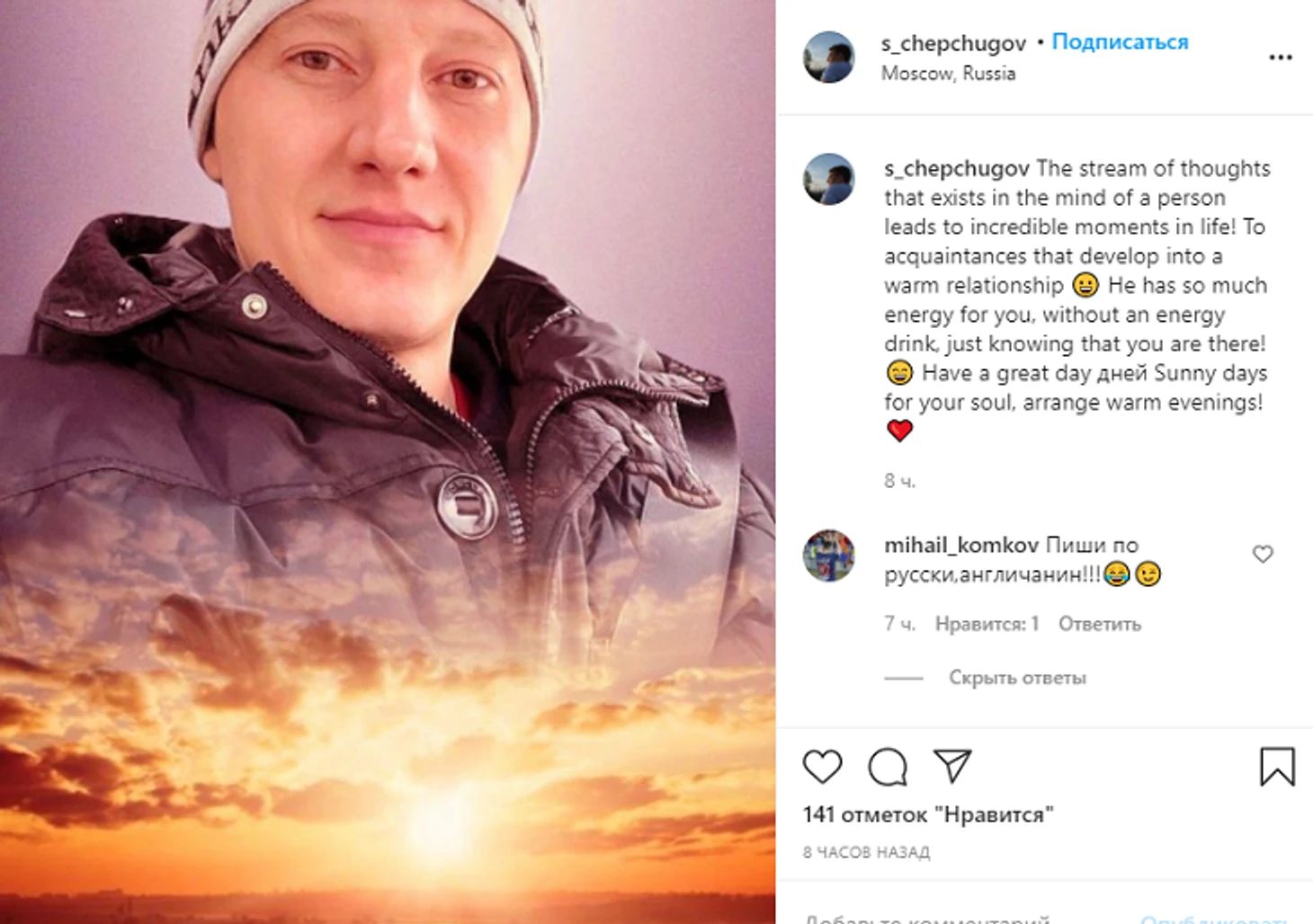Иногда подписчики не понимают Сергея просто потому, что он пишет не на русском. Но мы все перевели: «Поток мыслей, который существует в сознании человека, приводит к невероятным моментам в жизни! Знакомствам, которые перерастают в теплые отношения 😀 Удачного дня, солнечных дней для души, устраивайте теплые вечера! ❤️».