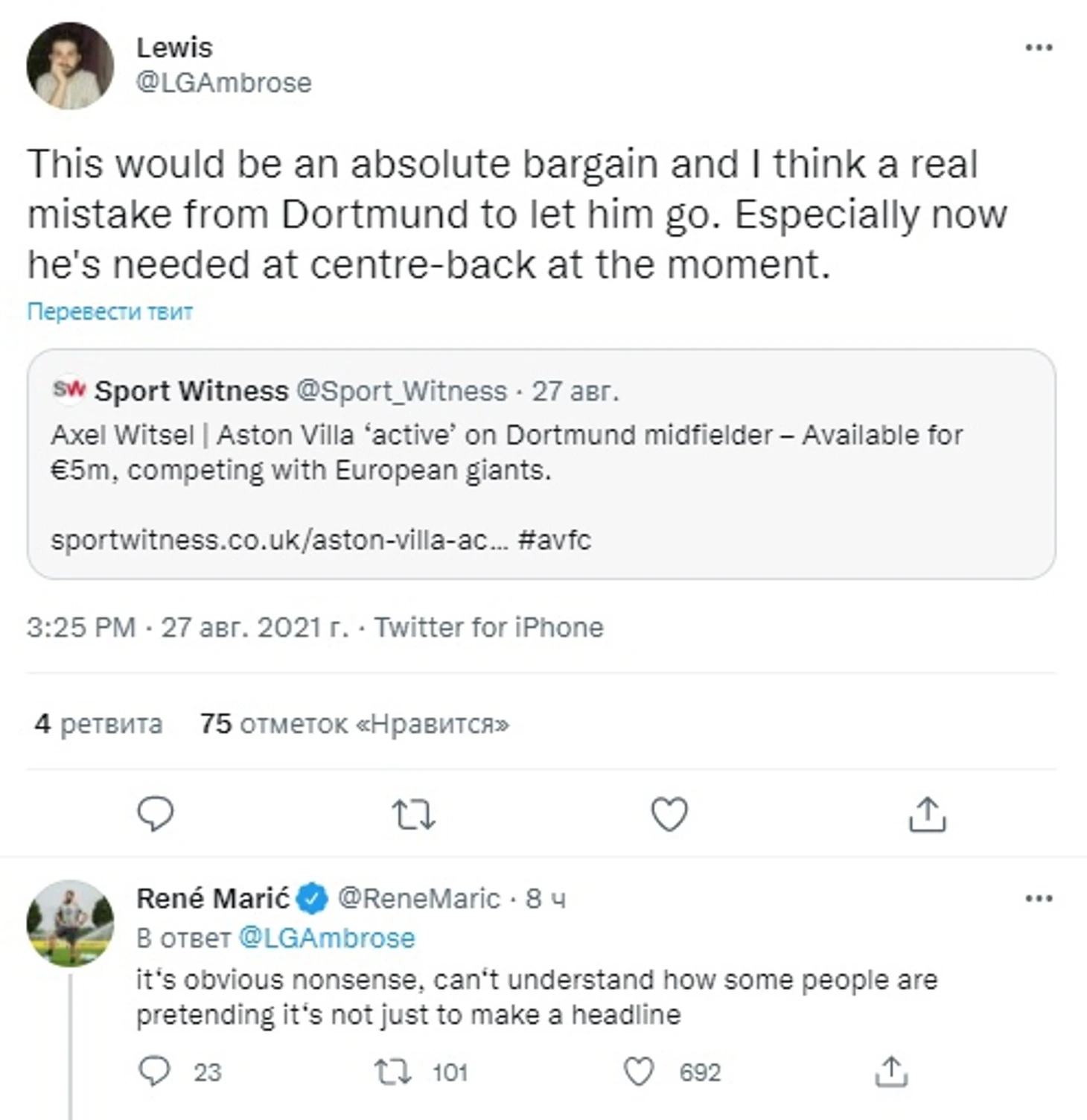 Эту новость ретвитнул блогер-аналитик и болельщик «Арсенала» и «Боруссии Д» Льюис Амброуз. Отметил, что за эту цену это просто отличная сделка для англичан – и ошибка для немцев, потому что альтернативы Витцелю в составе сейчас нет.
