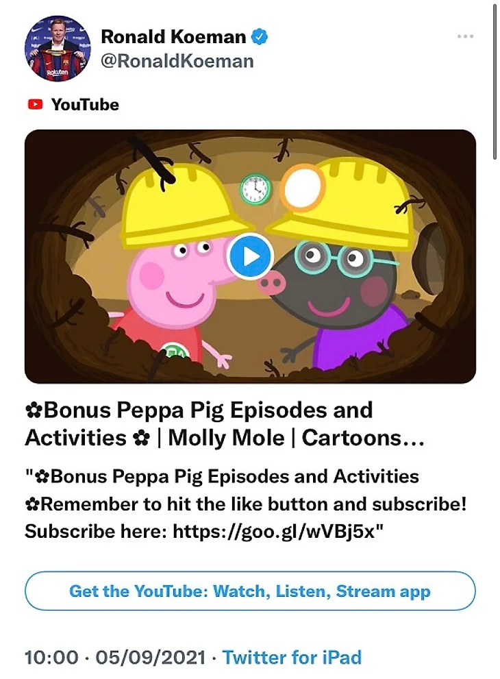 Недавний твит Роналда Кумана оставил в недоумении болельщиков «Барселоны». Главный тренер неожиданно пальнул в твиттер ссылку на мульсериал «Свинка Пеппа».