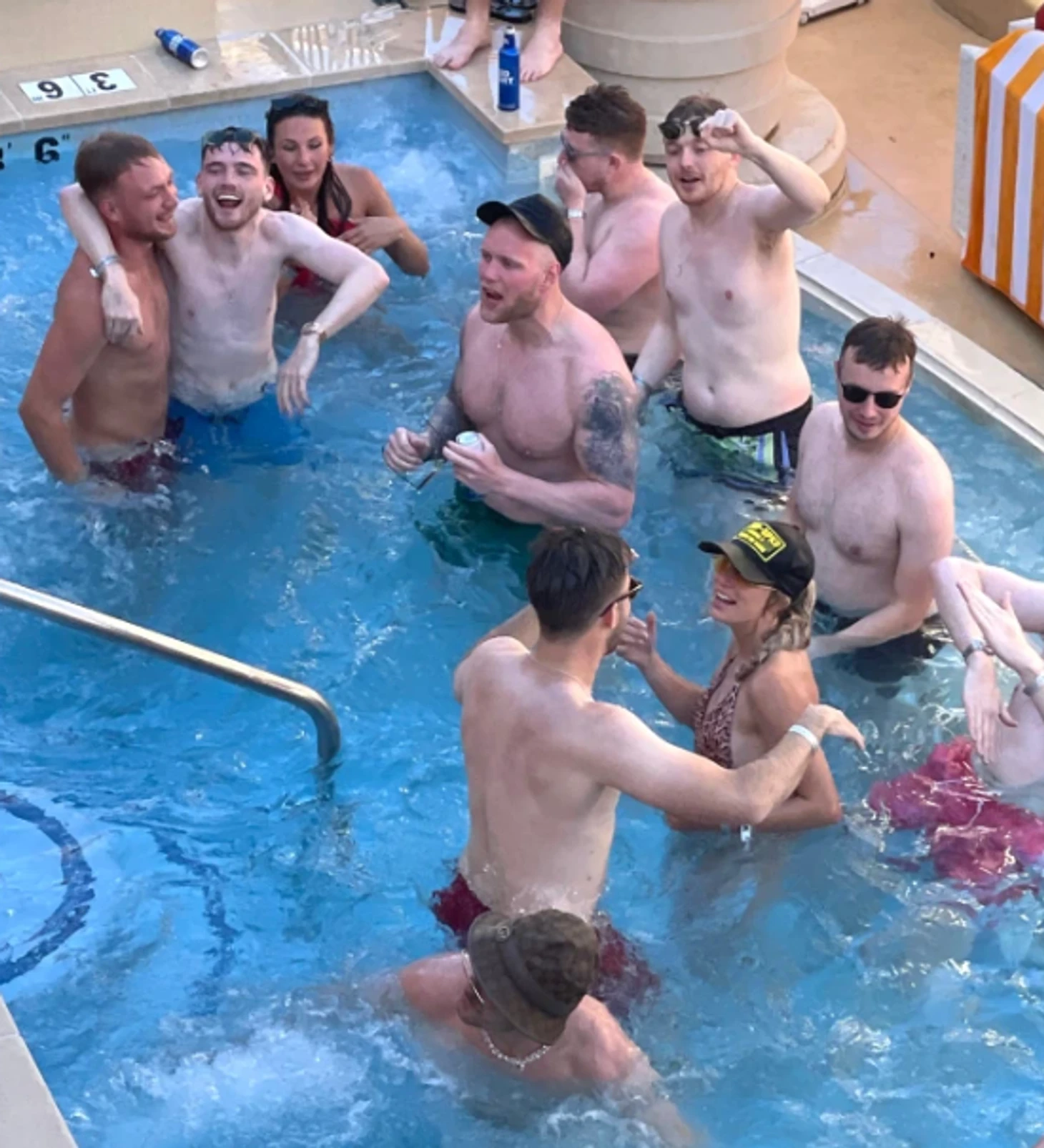 Отдых продолжился у бассейна, где Джек поделился навыком держать банки пива в плавках.