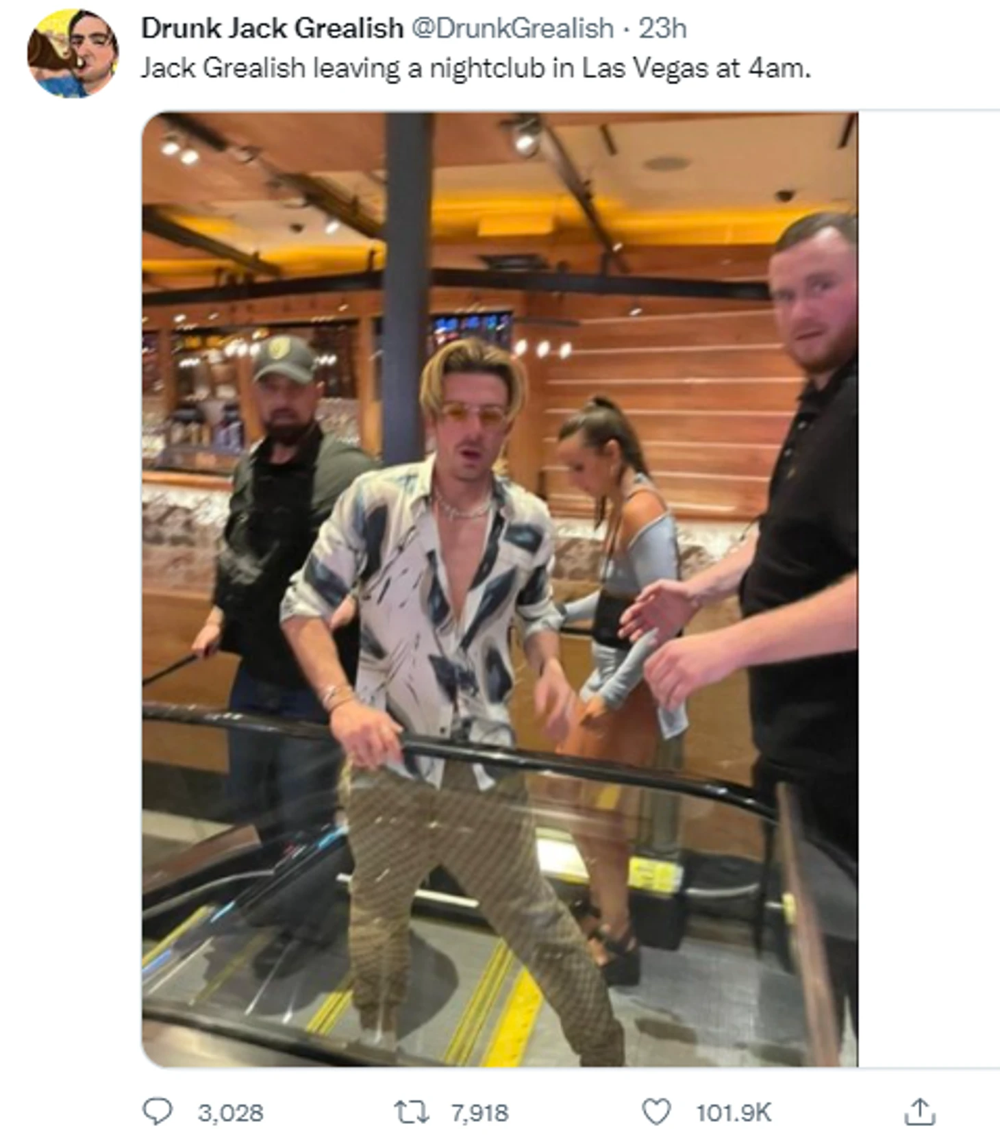 А вскоре появилось фото, где полузащитник «Сити» выходит из этого клуба в 4 утра. Забавно, что кадр в итоге завирусился в твиттер-аккаунте под названием «Пьяный Джек Грилиш».